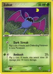 Zubat (Japanese: ズバット Zubat) is a Grass-type Basic Pokémon card. It is part of the EX Team Rocket Returns expansion.