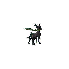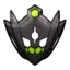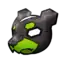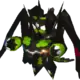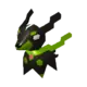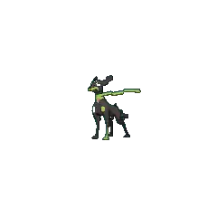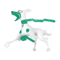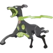 Zygarde 10% Forme has a relatively small canine body. It is primarily black with a green collar and a leash-like extension on its neck. Additional green markings include: two hexagon markings on its chest, a small hexagon over each eye, the area around its mouth, and its front left paw. There is an elongated, red hexagon marking attached to the collar marking. Its eyes are white hexagons with no discernible pupils and there is a thin, white line on its forehead. On each of its legs are hexagonal extensions: two on the back of each elbow, one behind each knee, and two on each hip. One of the hip extensions is longer than the other on each hip. This form has razor-sharp teeth and is skilled at close range combat. It is also capable of running at speeds greater than 60 miles per hour (100 kilometers per hour).