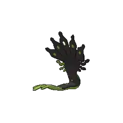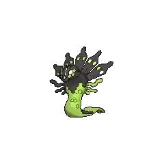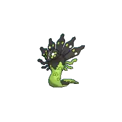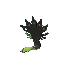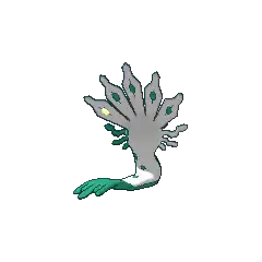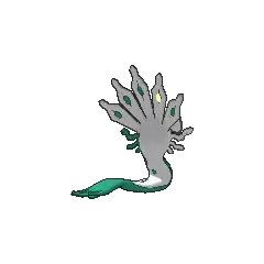 Zygarde is a Pokémon whose form depends on the percentage of its Cores and Cells gathered together. A Zygarde Core is the brain of the Zygarde. It is a small, green Pokémon with a gelatinous body. It has a large, round head with a beak-shaped protrusion on the front, a thin, hook-shaped tail, and a red hexagon suspended in its body. Within its head is a single eye with a black pupil; beside this eye is another white oval that may be a second eye. As seen in the anime, Zygarde Cores are capable of absorbing sunlight to regain their strength and can speak telepathically. Zygarde Cells make up every other part of Zygarde and appear nearly identical to the Zygarde Core. Unlike the Core, it has a flat body and head. It has a green pupil, a simpler, unhooked tail, and has a darker green, more elongated hexagon within its midsection.