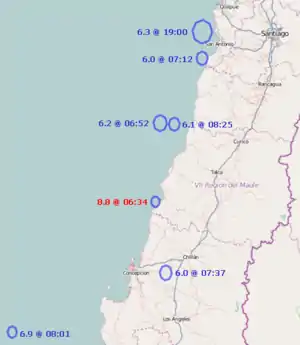 - The preceding is a contiguous excerpt from the introduction of "Wikipedia:2010 Chile earthquake"; references and wikilinks have been stripped from the original and new wikilinks related to OpenStreetMap have been added. For supporting references, refer to the Wikipedia source.