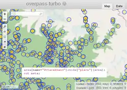 - This Overpass-api.de Query will extract landuse area polygons for a rectangular zone that cover most of Uttarakhand state; since it necessitates more ressources, a different api is used and the result automatically downloaded as an OSM file (2013-08-09, 7597 residential area polygons reported)