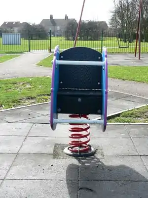 - Springies - these are chairs mounted on a big spring. The one shown here is marketed as being accessible, because it has a full seat and has well places grab bars; however we've not found it very useful. A corner case perhaps on what should be considered accessible play.