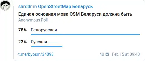 У верасьні-кастрычніку 2022 было праведзена галасаваньне па прапанове выкарыстоўваць беларускую мову па замоўчваньні на тэрыторыі Беларусі якую падтрымала больш за 3/4 галасоў: https://wiki.openstreetmap.org/wiki/Be:Belarus_language_issues/Migration_proposal