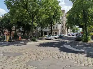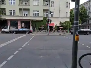 Kreuzung ohne markierte Querungen, aber mit gekennzeichnetem Radwegübergang