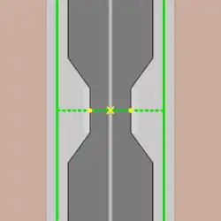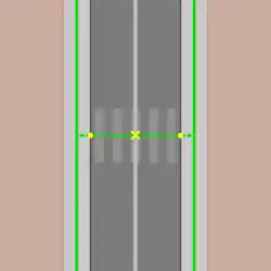Für Querungen, die zwar nicht im Bereich des fließenden Verkehrs (in der Straßenmitte), aber am Fahrbahnrand mit Markierungen versehen sind. Werte für crossing:buffer_marking=*: both für Markierungen an beiden Straßenseiten, left/right für einseitige Markierungen (je nach Linienrichtung der Straße, vgl. oben: Gehwegvorstreckungen), yes wenn nicht weiter bestimmt/erkennbar.