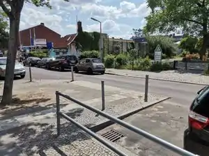 An Kreuzungen ergibt sich außerdem von selbst, dass gegenüberliegende Gehwege über die Fahrbahn hinweg miteinander verbunden sind – unabhängig davon, ob beispielsweise Bordsteine tatsächlich abgesenkt sind. Besonders an T-Kreuzungen kann es dabei jedoch passieren, dass eine Querungsmöglichkeit auf einer Straßenseite von parkenden Autos verstellt ist, was für einige Nutzergruppen ein unüberwindbares Hindernis darstellen kann. Gibt es andere Querungsmöglichkeiten in der Nähe, solltest du in solchen Fällen auf eine Verbindung verzichten. Gibt es in der Umgebung keine anderen Querungsstellen, solltest du die eingeschränkte Nutzbarkeit einer solchen (logischen) Querungsmöglichkeit verdeutlichen, wofür wir einen Punkt im Bereich des Parkstreifens mit barrier=parking_lane vorschlagen. (Hinweis: Die in solchen Situationen üblicherweise nicht abgesenkten Bordsteinkanten werden mit kerb=raised zusätzlich erfasst, was ein eindeutiger Hinweis im Routing für z.B. Rollstühle ist, solche Querungen zu meiden.)