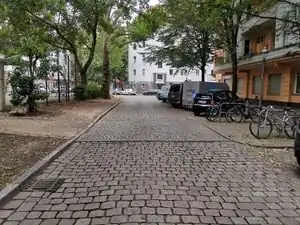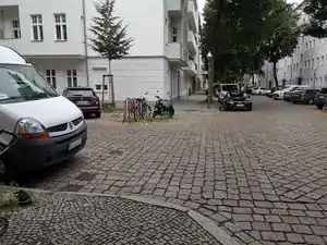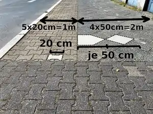Breite typischer Gehwegsteine in Berlin zur einfachen Breitenschätzung: H-/Doppel-T-Verbundpflasterstein (Breite lange Seite: 20 cm) und Berliner Platte (im 45-Grad-Winkel verlegt, 50 cm breit). In einigen Bezirken typisch sind auch die 1 Meter breiten historischen Granitplatten, siehe Wikipedia: Gehwegplatte
