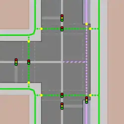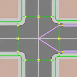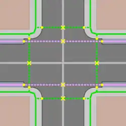 Schematische Darstellung separat gemappter Gehwege und Querungsstellen an einer Kreuzung.