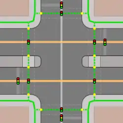Ampelkreuzung mit mehrspuriger Straße und Mittelinseln
