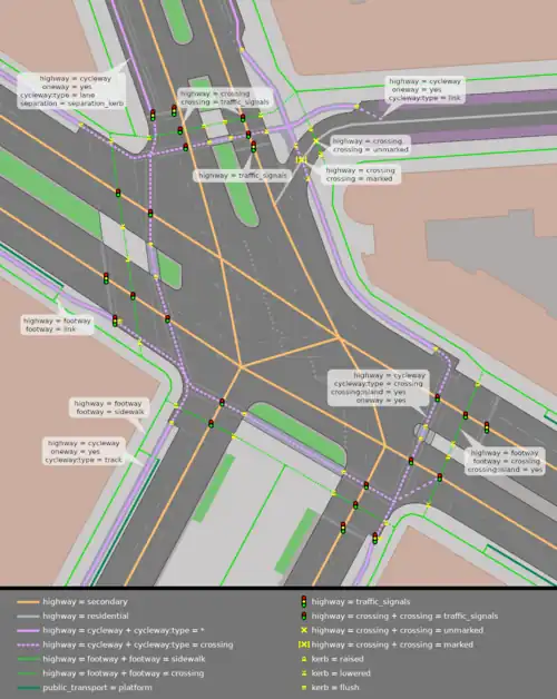 Beispiel-Mapping für eine komplexe Kreuzungssituation mit separat gemappten Rad- und Gehwegen