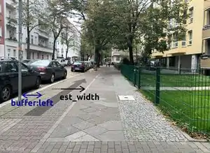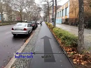 Ist nur buffer (ohne Suffix :left oder :right) angegeben, ist der Abstand nach links zur Fahrbahn gemeint. Nach Möglichkeit sollten aber beide Seiten angegeben werden. buffer:right ist insbesondere als Schutzabstand links neben parkenden Autos (Gefahr durch sich öffnende Autotüren) oder in Gehwegnähe neben dem Fußverkehr interessant. |