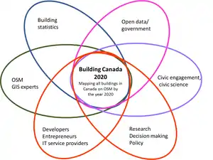 As a community-led initiative, Building Canada 2020 can foster collaboration between a multitude of stakeholders (civic groups, private sector, academia, public sector...) to achieve a specific common goal benefiting each stakeholder, as well as society as a whole. This approach is inspired by principles of civic science, more specifically, civic data. A community-led approach enables stakeholders sharing a common vision to share ownership and accountability for its realization as well as the creation of its output: open, accurate and complete data on all buildings in Canada, accessible through OSM.