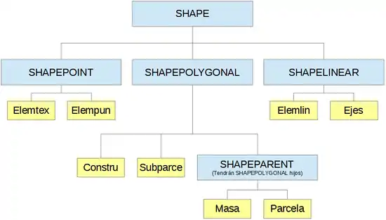 De todos los shapes se guarda su códidog de masa (código de manzana) o tipo de elemento (para elementos puntuales, lineales y textuales) o nombre de calle (para ejes) y se agrupan en función de esos códigos para que las operaciones solo se hagan entre los elementos de esos grupos. Gracias a este Divide y Vencerás se ha conseguido una gran mejora en el tiempo de procesado y de hecho la operación más costosa que es la de asignación de portales a parcelas, tarda tanto por no poder crear agrupaciones para esta operación. Los shapes se dividen en distintas clases las cuales facilitan su manejo y la diferenciación entre ellos: