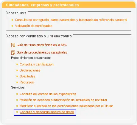 - Acceder a la sede electrónica de Catastro, por el apartado "Consulta y descarga masiva de datos".