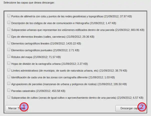 - Descarga de cartografía vectorial (formato Shapefile). Descarga los archivos urbano y rústico (sin Historia) de la población. En la ventana de descargas, después de seleccionar provincia y municipio, se debe pulsar el botón "Ver capas disponibles" y a continuación en "Marcar todas".