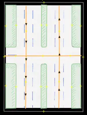 Roads that lead to or cross a ciclovía must be modified to include turning restrictions. In order to be able to map the segments correctly, it is recommended to split the road segments, at most up to the previous or next corner of the restriction node. This prevents to have relation members that span several blocks, which, if modified, can damage the constraint. These restrictions may seem somewhat redundant and unnecessary, but they strengthen the mapping of the ciclovía, and prevent routers from generating a route through the ciclovía corridors during their schedule.