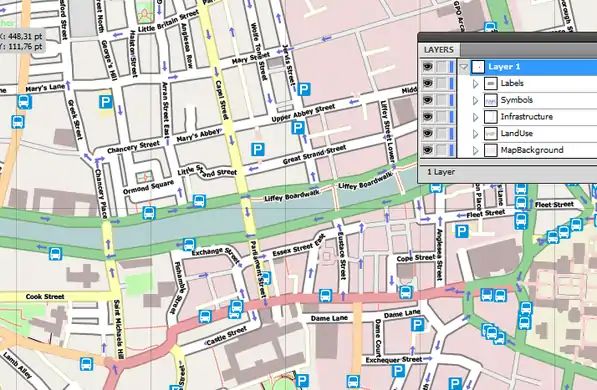 Viewing a map of Dublin City Centre in Adobe Illustrator - SVG file was produced by latest release of Maperitive |