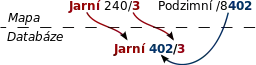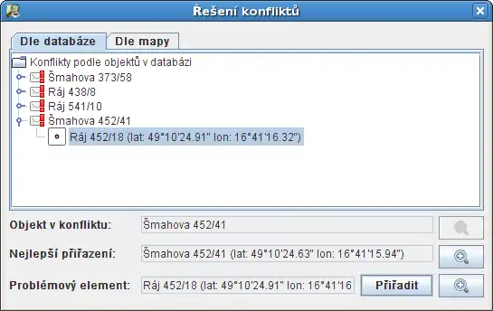 Z menu vyberte Adresy → Přiřadit adresy. Tento dialog prochází všechny relace (včetně těch, které vznikly manuálně vyřešením konfliktů) a snaží se upravit mapu tak, aby přesně odpovídala elementům v databázi. Příklad, jak takové přiřazení může vypadat je na následujícím obrázku: