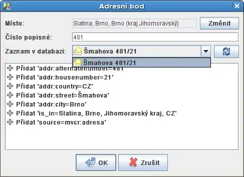 Uvedený dialog je vhodné používat i na oblasti, ve kterých existují adresní body z dřívějších masových importů. Ty totiž neobsahují některé užitečné tagy jako např. is_in=*, addr:city=*, nebo addr:country=*.