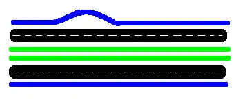 The two green ways are the tram, on both sides there is a secondary road (two lanes each side), and next to them there are two cycleways, the top one having some oddities: First it's departing a little bit from the road and getting back there, second on the right side, it's twoway, on the left it's only oneway.
