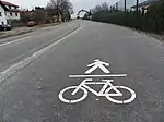baulich getrennt von der Fahrbahn und mit Symbol "Fußgänger" über "Fahrrad", getrennt durch einen waagrechten Strich, markiert