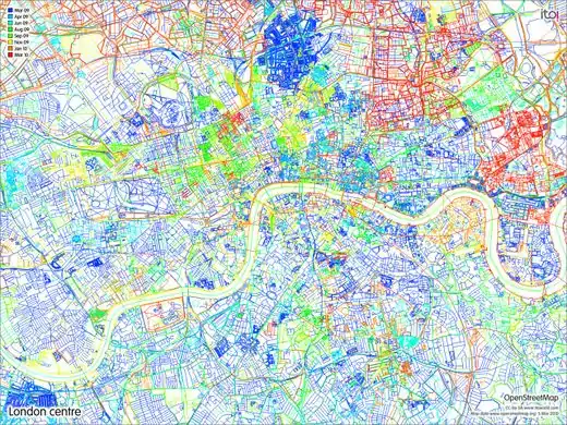 - English : Map showing parts of London that have been updated in the last year (from OSM Mapper)