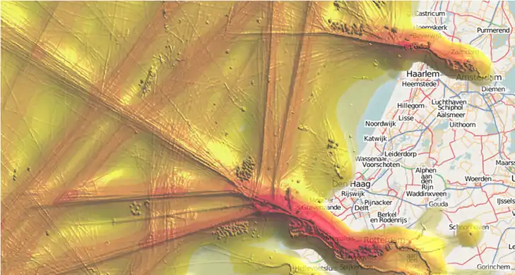 - English : A multi-scale density visualization shows vessel movements in front of Rotterdam harbor.