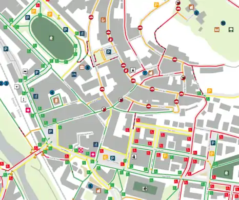 - English : The accessibility map of Castelfiorentino, Italy was made in the participatory process “Free Access for all”. Printable version, based on OSM data, can be downloaded for free.