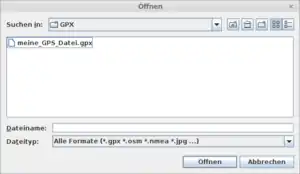 GPX-Dateien öffnen![]() Meistens möchte man ja die gerade aufgezeichneten GPS-Spuren verarbeiten. Diese lassen sich per Drag and Drop einfach in das JOSM-Fenster ziehen. Alternativ geht man auf Datei — Öffnen... und öffnet mit dem Dateimanager die GPX-Datei durch Auswählen. Falls du Fotos mit Geotags oder eine Wegpunktedatei (NMEA-Datei) hast, kannst du auch diese in den Editor ziehen oder öffnen. ![]() Du siehst jetzt die GPS-Spur und eventuell die Punkte oder Fotosymbole, sofern geladen. Diese Spur wird im Normalfall nicht direkt in eine Straße oder einen Pfad umgewandelt; das gäbe zu viele Punkte, und auch fehlerhafte Ausreißer wären in der Karte. Der normale Workflow sieht so aus, dass man diese Spur nun im Editor Klick für Klick in groben Zügen nachzeichnet. Dazu mehr weiter unten im Abschnitt Straße hinzufügen. Am linken Bildschirmrand befinden sich oben die Schaltflächen für die Datenbearbeitung und darunter eine Reihe von Schaltflächen, mit denen sich Paletten am rechten Bildschirmrand ein- und ausblenden lassen. Da einige dieser Paletten sehr nützlich sind, schaltest du einige davon am besten dauerhaft ein.