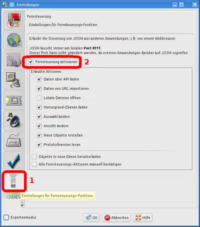 Zur direkten Steuerung von JOSM durch keepright kann JOSMs Fernsteuerung aktiviert werden: