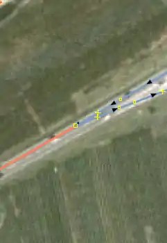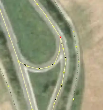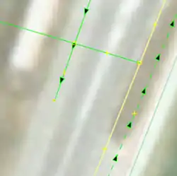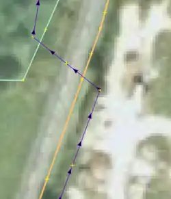 | Hier wird nach Spitzen in Wegen gesucht und geprüft, ob turn restrictions (Abbiegebeschränungen bzw. Wendeverbote) fehlen: Straßen, die in einem sehr spitzen Winkel aufeinander treffen (explizit oder implizit anhand von Einbahnstraßen), sollten eine Art von Abbiegebeschränkung haben, die das Umfahren der scharfen Mündung verbietet. | |