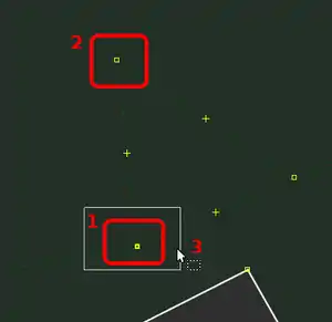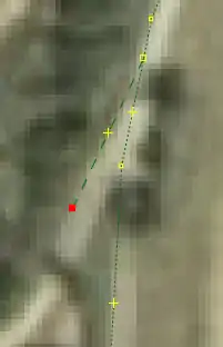 | Bevor man diesen Fehlertyp behebt, sollte man sich vorher mit den beinahe Verbindungen (vgl. Kapitel Beinahe-Verbindungen) beschäftigen, denn mehrere Es ist aber auch möglich, dass sich Wege- und Landschaftsnutzungspunkte überlagern, jedoch nicht miteinander verbunden sind, was vielleicht ganz praktisch wäre, wenn man die Straße verschiebt und die Landschaftsnutzung dementsprechend auch verschoben werden soll. Jedenfalls ist dieser Fehlertyp nicht ohne Weiteres auf Anhieb sichtbar. Man beachte den Unterschied der Punktdicke zwischen (1) und (2) in Abbildung 112. Wenn sich mehrere Um den Fehler nun zu beheben, klickt man am besten mit der linken Maustaste neben die |