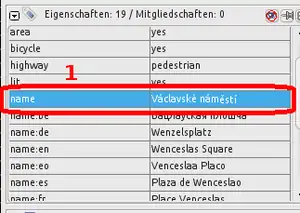 | Sobald hinter dem name-Tag ein Sprachkürzel angegeben ist und sich ein name-Tag ohne Sprachkürzel in der Tagliste befindet (1), wird dieser Fehlertyp angezeigt. Wie im Beispiel in Abbildung 113 ersichtlich, könnte man einen neuen Tag name:cs=* mit demselben Inhalt wie das name-Tag einfügen, was anzeigt, dass es sich um die Tschechische Sprache handelt.