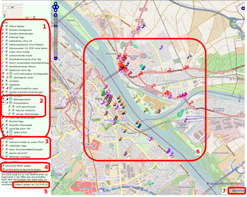 - (1) Hier könnt ihr die Anzeige der Fehlerarten aus- oder abwählen. Links neben der Fehlerart findet ihr die dazugehörige Farbe des Blitzes, der in der Karte unter (6) dargestellt wird. Die ausführliche Beschreibung aller Fehlerarten findet ihr unter Fehlerbehebung mit keepright.