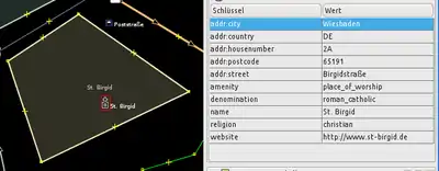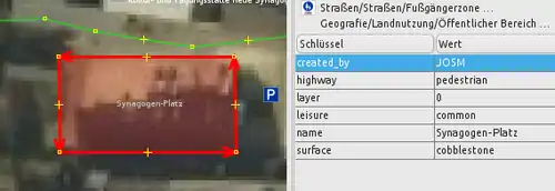 Fläche und drückt die Tastenkombination Strg + Umschalttaste + V (alternativ JOSM-Menü: Bearbeiten → Merkmale einfügen). Auf diese Weise hat man alle Eigenschaften des