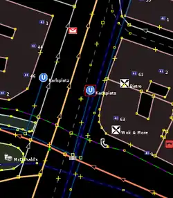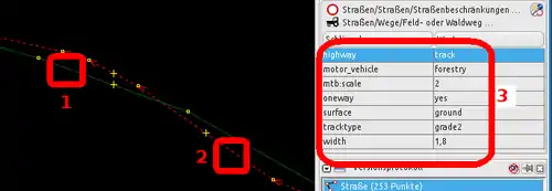 Nodes (Knotens) angezeigt, wie sie in der OSM-Datenbank eingetragen ist. Ein Klick auf die Nummer zeigt den