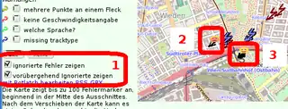 Wenn die Optionen ignorierte Fehler zeigen und vorübergehend Ignorierte zeigen nicht markiert sind (1) (vgl. Abbildung 8), dann werden die als ignoriert markierten Fehler (2) und die als vorübergehend ignoriert markierten Fehler (3) beim nächsten Verschieben des Kartenausschnitts nicht mehr angezeigt. Möchte man Sie wieder anzeigen lassen, muss man die Optionen in (1) wieder markieren. Die als vorübergehend ignoriert markierten Fehler werden nach einer erneuten Überprüfung der OSM-Datenbank durch keepright aus der keepright-Datenbank entfernt. Schließlich sind die Fehler behoben und treten nicht mehr auf. Ist der Fehler doch nicht behoben worden, wird er auch nach einem erneuten Durchlauf von keepright angezeigt. Im Kommentarfeld steht dann beispielsweise der Hinweis: [error still open, 2012-01-21]. Der Fehler muss also erneut bearbeitet bzw. behoben werden. |