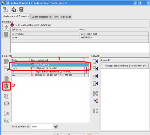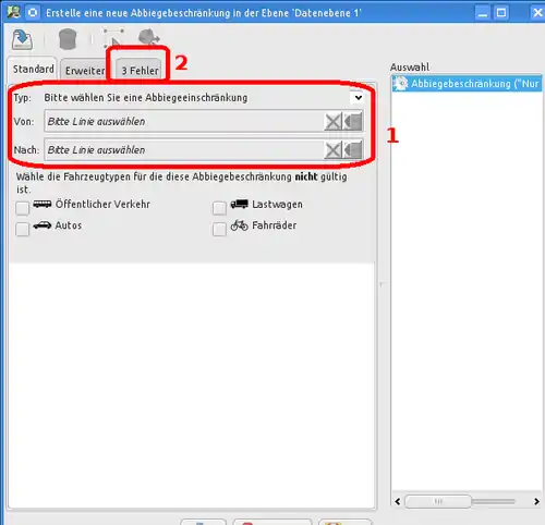 In Abbildung 102 treffen unterschiedliche Straßen in eine Zur Behebung des Fehlers sollte man an dieser Stelle ein Abbiegeverbot setzen, wie in Kapitel Abbiegeverbote ausführlich beschrieben. Das Infofenster von keepright gibt sogar einen direkten Hinweis, wie das Abbiegeverbot definiert werden muss (die jeweiligen Rollen der Wege sind hier hervorgehoben):