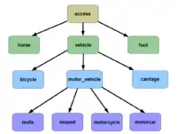 Zur Angabe eines Verkehrsmittels wird der Schlüssel access=* durch Gruppenschlüssel (z.B. vehicle=* für alle Fahrzeuge) oder Einzelschlüssel (z.B. bicycle=* für Fahrräder) ersetzt. Dadurch können unterschiedliche Zugangsarten getrennt angegeben werden. Die Gültigkeits-Vererbung zwischen Gruppen, Untergruppen und einzelnen Verkehrsmitteln erleichtert die Angabe der Beschränkung.