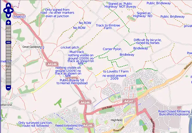 - Nicht zu verwechseln mit Hinweis/Fehler melden (Notes) – dies ist eine Funktion auf der OpenStreetMap-Website (www.osm.org), mit der Besucher auf einfache Weise auf einen Fehler in den Kartendaten hinweisen können. Diese Funktion ist auch in vielen Editoren implementiert.