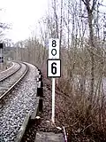 Wenn die Geschwindigkeit durch dieses Signal gegenüber der vorherigen Geschwindigkeit verringert wird, wird dies durch ein entsprechendes Vorsignal railway:signal:speed_limit_distant=DE-ESO:lf6 vorangekündigt. |
