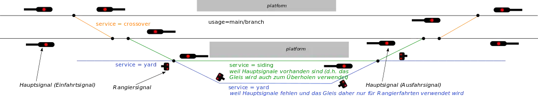 service=* orientiert sich nur eingeschränkt an den Zügen, die die Gleise benutzen, sondern an der Leit- und Sicherungstechnik. Es ist irrelevant, ob ein Gleis in einem Bahnhof nur von Regionalzügen oder auch von Fernverkehrszügen befahren wird. service=siding oder usage=main/branch orientieren sich an den Signalen, Weichen und der zulässigen Geschwindigkeit.