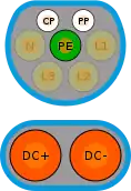 IEC 62196-2 Type 2, or VDE-AR-E 2623-2-2, combined charging system (CCS) plugs, with 2, larger, extra pins for DC charging. | |