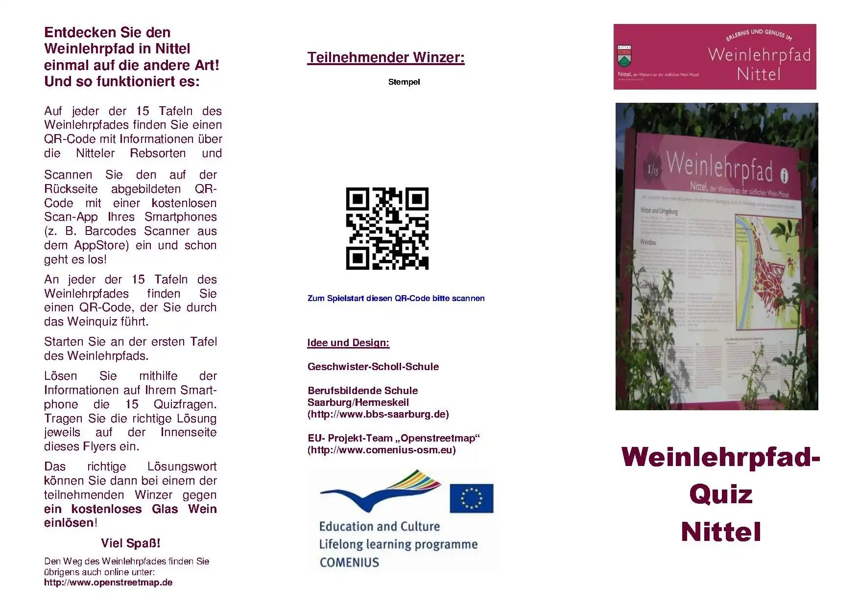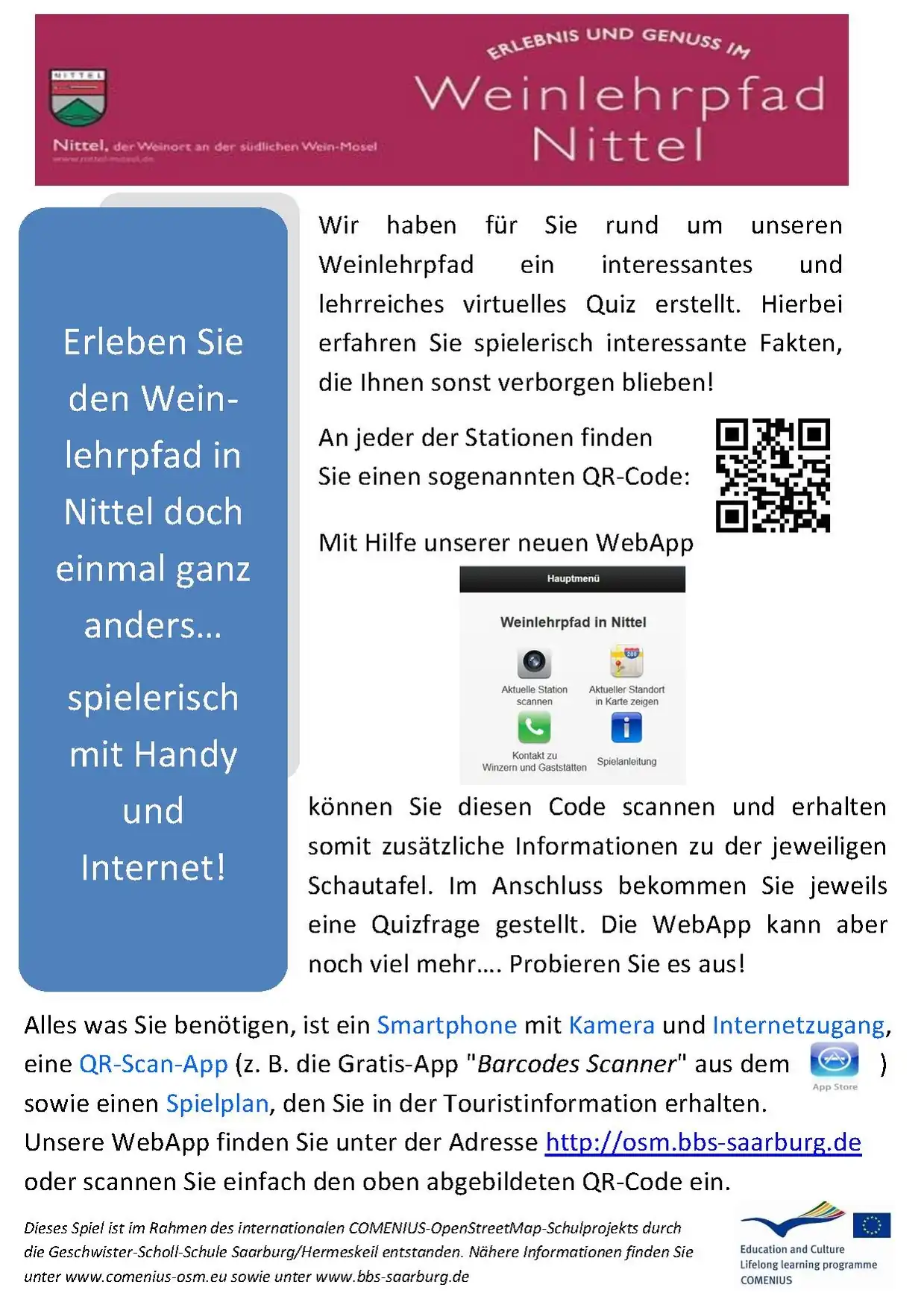 Für den Weinlehrpfad der Gemeinde Nittel wurde ein Spiel entwickelt, bei dem "Jung und Alt" bei einer kleinen Wanderung Spaß haben sollen und auch ein wenig über Jahreszeiten, Rebsorten und die Arbeiten im Weinberg lernen können. Dazu wurde die WebApp erstellt, die natürlich auf die Bedürfnisse mobiler Geräte abgestimmt ist. Um zu den Fragen zu gelangen, die in der WebApp hinterlegt sind, ist an der jeweiligen Station der QR-Code zu scannen. Dann sind Fragen zu beantworten und letztlich sind die Ergebnisse in ein Kreuzworträtsel zu übertragen. Ist das Kreuzworträtsel korrekt gelöst, kann man sich gegen Abgabe des Lösungswortes bei den teilnehmenden Winzern ein kostenloses Glas Wein schmecken lassen. Wenn Sie sich die Spielanleitung genauer ansehen wollen. ;-)