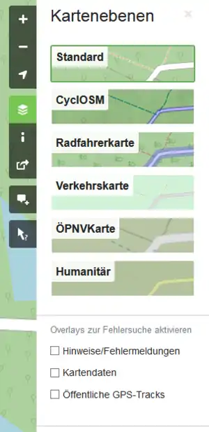 Um die Daten-Ansicht aufzurufen, muss in der rechten Seitenleiste der Karte auf openstreetmap.org das Ebenen-Symbol angeklickt und dort der Eintrag "Kartendaten" aktiviert werden.