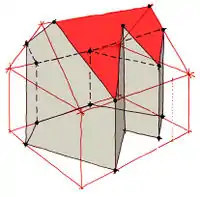 Bei dem Typ 5.6 wird algorithmisch der größte mögliche Kreis innerhalb des Grundrißpolygons gefunden (rote Fläche, Knotenpunkte blau) sowie restliche Dachfläche (grau) als flache Ebene (Typ 0.0) gelassen.
