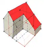 | Alle Dachflächen steigen in gleicher Neigung was an Winkelhalbierenden der Dachflächen zu sehen ist (nur 45° Winkel)
