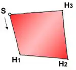Draufsicht: Verhalten vom Dachtyp 0.3 als irregularer Viereck. Der Startpunkt S an dem wir mit der Grundrisskonstruktion beginnen, sowie die Ausrichtung von dem Gebäudeumriss (hier gegen Uhrzeigersinn gezeichnet)entscheidet, wie das Dach in 3D aussiehen wird.