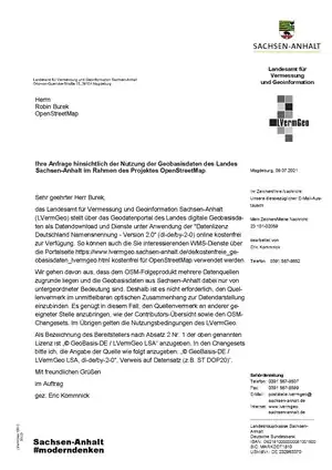 Die Geobasisdaten dürfen auch für OpenStreetMap-Zwecke genutzt werden und kann z.B. als WMS-Hintergrundbild in JOSM eingebunden werden. Wichtig ist dabei, dass aus den Daten KEINE automatischen Imports durchgeführt werden dürfen. Da die Geobasisdaten des LVermGeo offiziell unter der dl-de/by-2-0 veröffentlicht sind und diese primär nicht mir OSM kompatibel sind, wurde eine gesonderte Erlaubnis zur Nutzung der Daten eingeholt. Als Bezeichnung des Bereitstellers nach Absatz 2 Nr. 1 dieser Lizenz ist „© GeoBasis-DE / LVermGeo LSA“ anzugeben. Im Übrigen gelten die Nutzungsbedingungen des LVermGeo https://www.lvermgeo.sachsen-anhalt.de/de/nutzungsbedingungen.html. Alle über die Portalseite https://www.lvermgeo.sachsen-anhalt.de/de/kostenfreie_geobasisdaten_lvermgeo.html kostenfrei bereitgestellten WMS-Dienste können zum Abzeichnen für OSM verwendet werden.