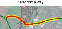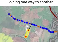 - Weg an einen anderen anschließen: Wenn beim Zeichnen eines Weges mit der Maus über einen vorhandenen Weg gestrichen wird, so werden dessen Wegpunkte blau hervorgehoben. Der Anschluss kann durch Klicken auf einen der hervorgehobenen Wegpunkte oder irgendwo auf den Weg hergestellt werden. Bei Letzterem wird ein neuer gemeinsamer Wegpunkt erzeugt.